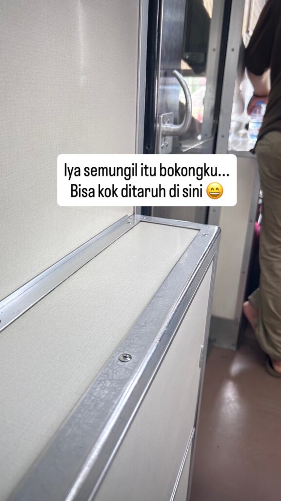 Dalam gerbong, sebagaimana biasanya pria-pria di stasiun tengah perjalanan (bukan awal mula perjalanan), saya tak kebagian tempat duduk.