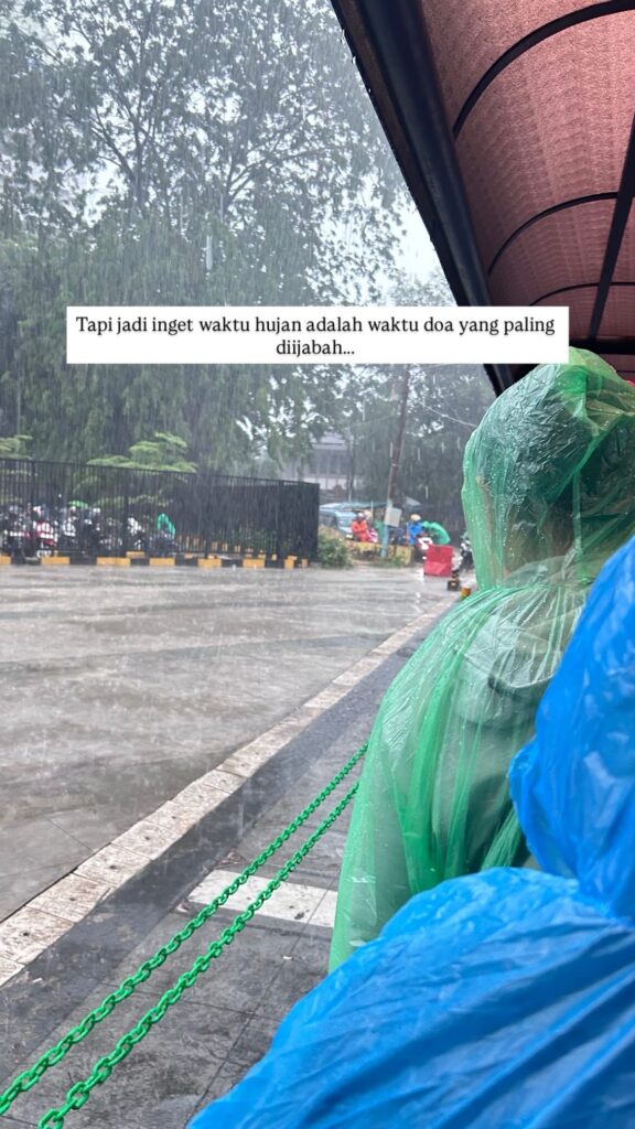 Sementara itu, kaki saya mulai lembap dan kemudian basah. Sederas itulah curah hujan pagi itu. Saya saat itu memakai celana hujan yang menjuntai sampai ke telapak kaki, yang seharusnya sudah bisa mempertahankan kaki agar kering. Tapi ternyata tembus juga karena di lantai, air mengalir bak sungai.